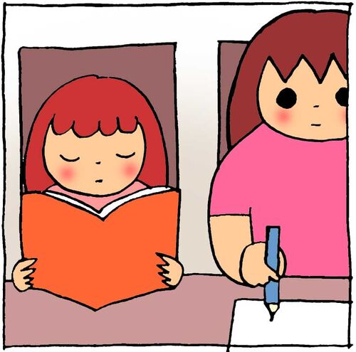 夏休みですが、2人で並んで勉強していました。 「お姉ちゃん、美濃ってどこだっけ?」 理系選択だし、そっちの分野に全然興味のないponちゃんは困って…… 適当なことを言ってbeeちゃんをがっかりさせました。 「お母さん、美濃って……」 「んー、西の方……」 ち…
